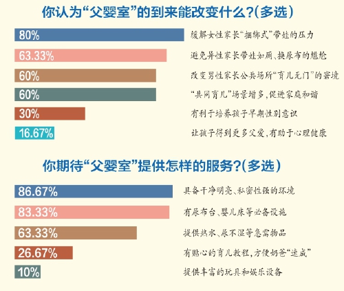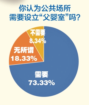 在记者的调查中,73.33%的人认为公共场所需要设立“父婴室”,相信其中就有不少“全能”奶爸。