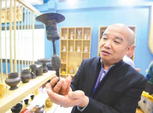 10月17日,第八届中国非物质文化遗产博览会在济南开幕。这是章丘龙山黑陶传承人闵伟展示自己的作品—蛋壳黑陶杯。