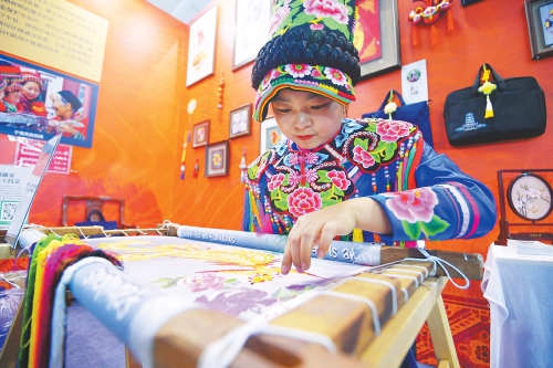 宁强羌族刺绣展示。(本报记者 崔健 摄)