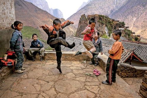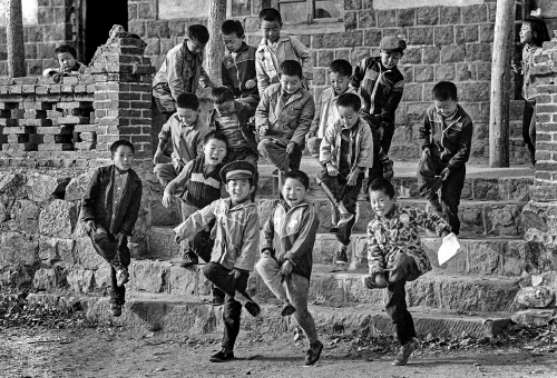 沂蒙山区的孩子玩“斗鸡”游戏。(1983年)