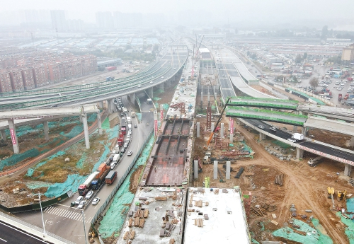 10月22日,在济南零点立交改造工程现场,新建的东西向主线桥南半幅车道已经基本合龙,最后一段箱梁等待浇筑混凝土。据了解,济南零点立交改造后为涡轮型枢纽互通,主线设置为济广高速主线桥和黄河南岸主线桥,共设置14条匝道,项目建成后将实现高速公路、城市快速路和城市主干路之间的交通转换,有效解决城市立交出入口常见的车辆交织问题。(本报记者 崔健 摄)