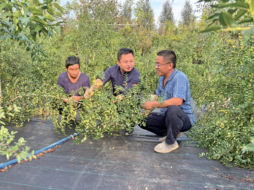 察晓辉(中)与平阴县返乡创业种植园联合打造了40亩酸枣种植示范园。