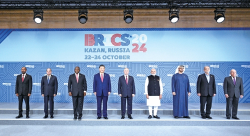 当地时间10月23日上午,金砖国家领导人第十六次会晤在喀山会展中心举行。这是会晤期间,金砖国家领导人集体合影。