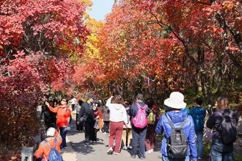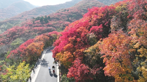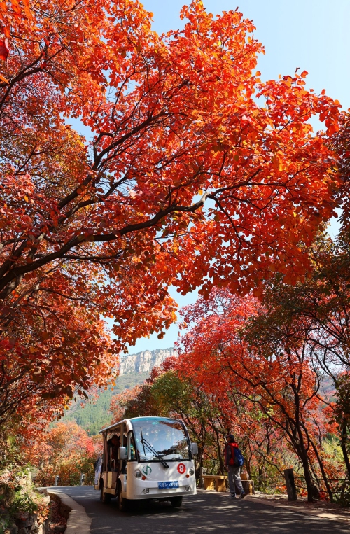 10月24日,红叶谷景区层林尽染,火红靓丽,正是一年中最佳观赏期,吸引着八方宾客前来观光游览。时下,红叶谷4000余亩黄栌林如火焰般遍布在群山之中,金黄、绿色的树叶交错在一起,直接化身醉人的仙境,美得让人移不开眼睛。秋光旖旎如画,快来红叶谷景区,在绚秋湖品绚丽多姿的秋日长卷,至万叶塔领略漫山红遍的恢宏景观,行于环秀路拍摄红叶铺满小径的绝美胜景,勇敢挑战高空玻璃漂流、丛林极速滑道,尽情品尝特色小吃,体验香巴拉民宿,感受红叶谷秋天的温馨与诗意。(本报记者 张宪政 通讯员 李煜 摄)