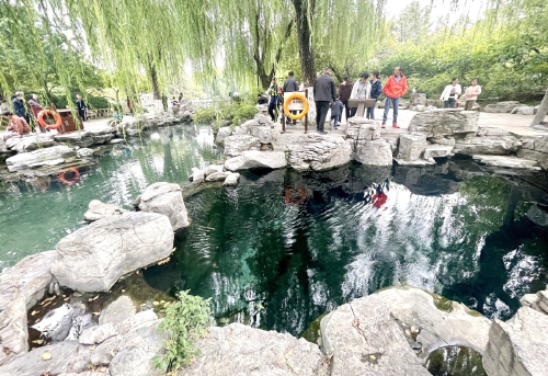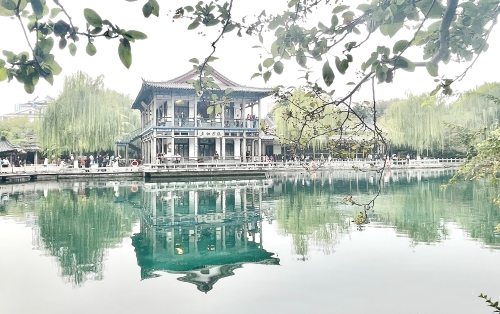 10月26日,济南五龙潭公园泉水如镜美如画,游客置身其中仿佛入画一般。金秋十月,济南美得更加轻松惬意,凉爽的风、潺潺的泉……一切都显得格外动人,与秋天相遇,“泉”是惊喜。 (本报记者 赵晓明 摄)