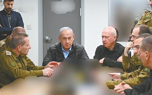 以色列军方10月26日称对伊朗军事目标实施精确打击。图为以色列总理内塔尼亚胡(中左)等坐在位于特拉维夫的国防军总部内。 (新华社发)