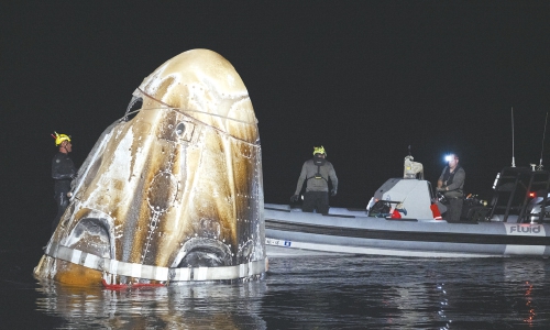 这张照片显示的是在美国佛罗里达州附近海域溅落后的“龙”飞船。 (新华社发)