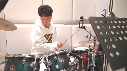 罗焱在练习架子鼓。