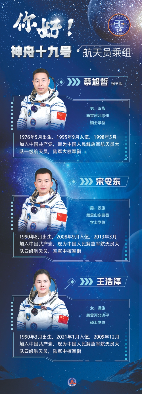 “宋令东入选前是空军飞行员;王浩泽入选前是航天科技集团有限公司航天推进技术研究院的高级工程师,是我国目前唯一的女航天飞行工程师,也将是我国第三位执行载人航天飞行任务的女性。”他说。