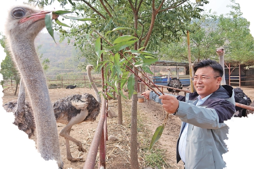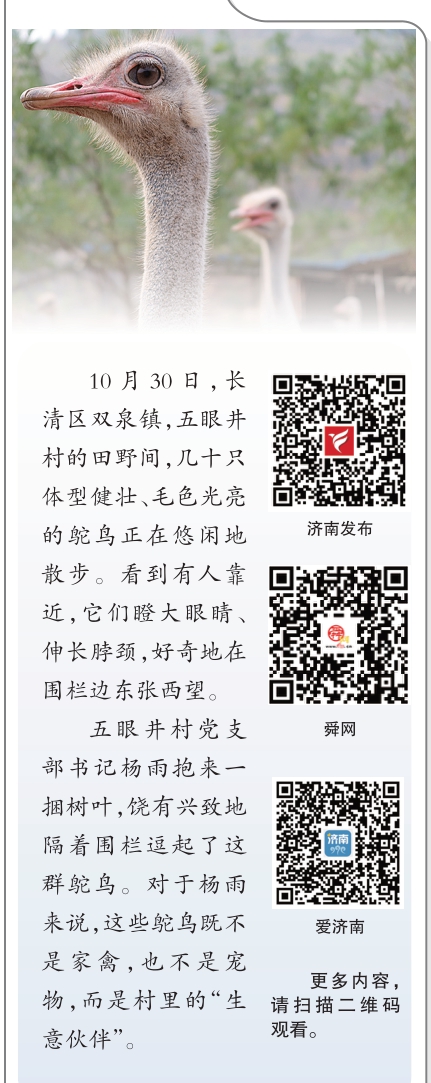 “有一回去滕州学习考察,看见一个农家乐老板养了几只鸵鸟,觉得很新奇。一问才知道,人家这鸵鸟不是养来吃的,是为了吸引顾客。”当时杨雨心里就有了盘算。他回到村里,与“两 委”成 员 一 商量,决定发展这一特色养殖,把村里的现有资源化零为整。