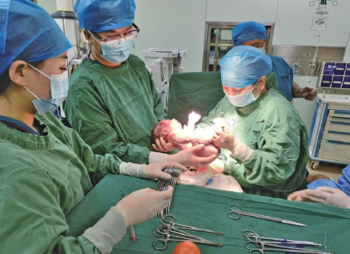 刘桂青(左二)带领医护人员行紧急剖宫产手术。