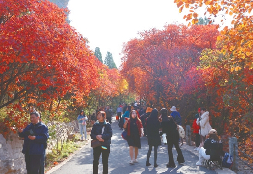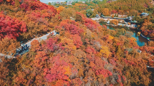 霜降过后的晚秋,红叶谷里的红叶如精灵般随风起舞,漫山遍野,蔚为壮观,现在正值最佳观赏期,也正是打卡游玩的好去处。每一处风景,都是大自然的秋日盛宴。别犹豫了,快来红叶谷一览盛景,错过这一季就要等到明年了。漫步红叶谷,每一步都会遇见不同的红叶风景,每一步都像踏在了诗行上,品味着晚秋独特的韵味!当清晨的第一缕阳光穿透薄雾照耀在红叶上,整个世界都被染上了金色的光辉。登上万叶塔远望,连绵起伏的山峦,层林尽染,如诗如画,令人心旷神怡,美得让人心醉! (本报记者 张宪政 通讯员 李煜 摄)