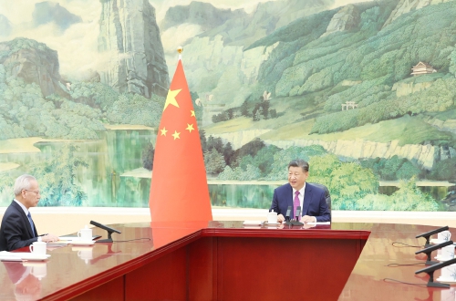 十一月一日下午,国家主席习近平在北京人民大会堂会见新当选并获中央政府任命的澳门特别行政区第六任行政长官岑浩辉。(新华社记者 丁海涛 摄)
