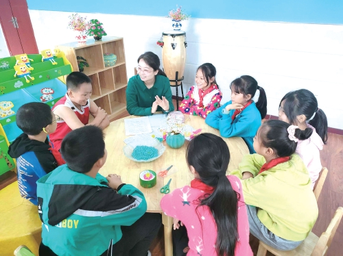 历下区心理教师禚喆在重庆武隆育才小学组织开展团体心理辅导活动。 (本报记者 张静 摄)