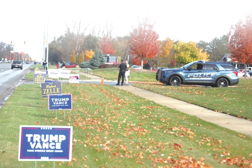 10月29日,共和党副总统候选人万斯在美国密歇根州萨吉诺镇举行竞选集会,集会地点附近插了许多支持特朗普和万斯的标牌。 (新华社发)