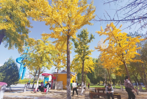 市民在泉城广场的银杏林游玩。近日,泉城广场泉标西侧的两片银杏林逐渐变成金黄色,金灿灿的树叶在阳光的照耀下散发出迷人的色彩,吸引了不少市民前来欣赏。(本报记者 崔健 摄)