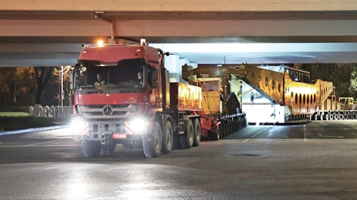 ●该设备装车后,总长94米、宽5.3米、高5米,共34轴、296个轮胎