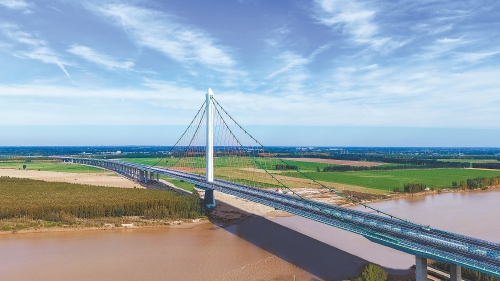 济南大北环项目设置黄河特大桥一处,大桥全长5837米,大桥塔高166.2米,高耸的塔柱与柔性的主缆配合,将重达2.4万吨的钢箱梁于黄河之上拉起,形成一塔挑两跨的独特景观,是目前世界上跨度最大的独塔等跨自锚式悬索桥。