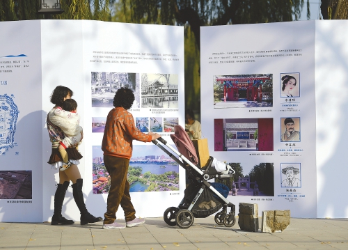 近日,游客在曲水亭街西侧参观“济南泉·城文化景观”申遗成果展。 (本报记者 崔健 摄)