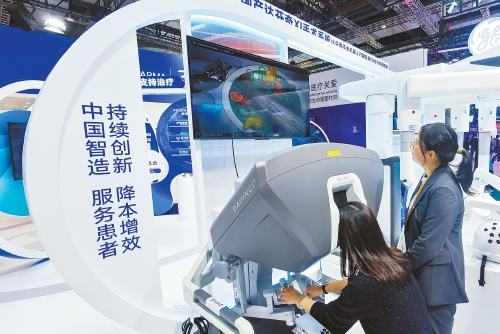 11月8日,一名参观者(左)在第七届进博会医疗器械及医药保健展区复星医药展台体验操作一款外科手术机器人。 (新华社发)东方之约,五洲汇聚。黄浦江畔,万商云集。
