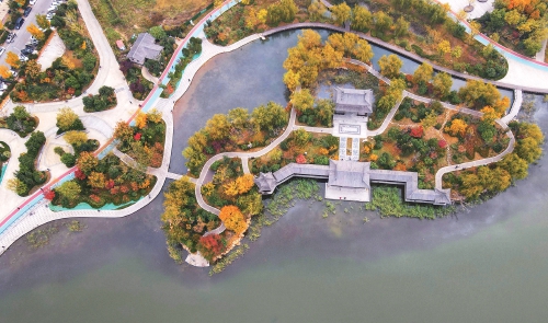 11月10日,济南云锦湖层林尽染,环绕湖畔的植被展现出深秋时节的浪漫景色,犹如打翻了调色盘一样五彩斑斓,和亭台廊榭倒映在湖面之上,整体环境与一路之隔的小清河交相辉映,景致引人沉醉,已成为济南北部城区一颗耀眼的明珠,吸引了不少市民来此环湖漫步,游玩赏景。