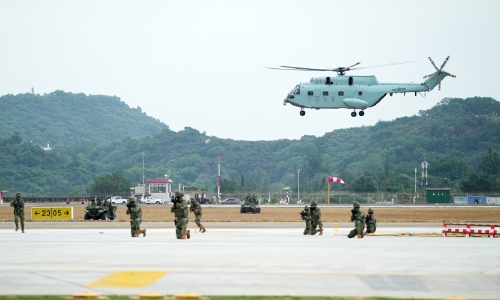 11月10日,人民海军舰载直升机开展适应性飞行训练。 (新华社发)