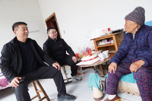 牛玉忠(左)带韩凯(中)给孤寡老人过生日。