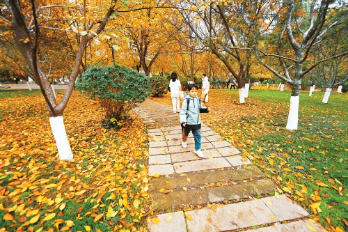 11月16日,在五龙潭公园内,片片银杏叶随风飞舞,沙沙作响。金灿灿的银杏叶铺满园内道路及草坪,远远看去,像是一幅浪漫的金色油画。不少市民在此赏落叶、拍照,享受美好周末时光。(王汗冰 摄)
