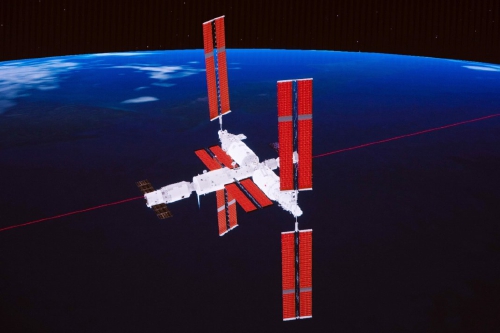 11月16日在北京航天飞行控制中心拍摄的天舟八号货运飞船与空间站组合体完成交会对接的画面。 (新华社发)