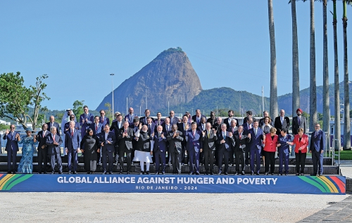 当地时间11月18日上午,国家主席习近平在巴西里约热内卢出席二十国集团领导人第十九次峰会。峰会把“构建公正的世界和可持续的星球”作为主题,并决定成立“抗击饥饿与贫困全球联盟”。这是习近平同与会领导人共同参加巴方发起的“抗击饥饿与贫困全球联盟”合影。 (新华社记者 李学仁 摄)