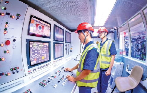 足有6层楼高、相当于16辆公交车连接在一起的长度,世界最大直径泥水平衡盾构机“山河号”,发出“轰隆隆”声响,工作人员热火朝天地开展施工作业。