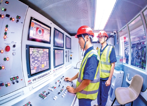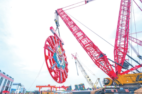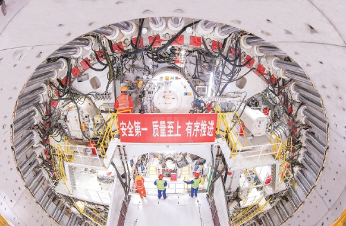 足有6层楼高、相当于16辆公交车连接在一起的长度,世界最大直径泥水平衡盾构机“山河号”,发出“轰隆隆”声响,工作人员热火朝天地开展施工作业。