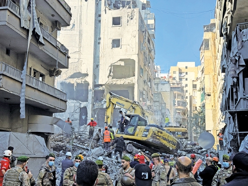 11月23日,在黎巴嫩贝鲁特,人们在遭空袭的建筑废墟参与搜救。(新华社发)