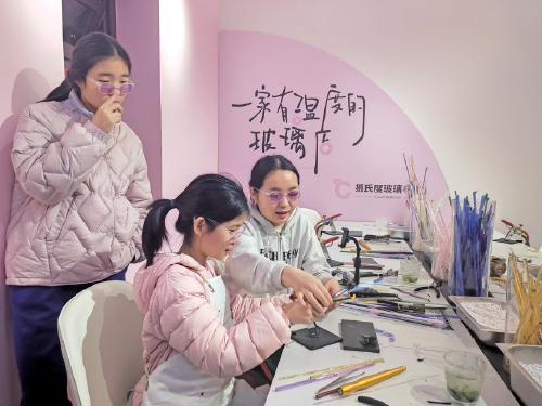消费者张炳轩戴上专业而炫酷的“小紫”护目镜,手持琉璃料条,体验做一件独一无二的琉璃工艺品,他说:“新鲜、有趣,价位也适中。”