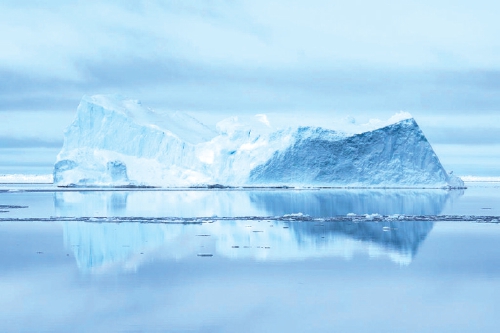 块头不大,通体雪白,这座南极冰架上分裂掉落的冰山从湛蓝的海平面和略显阴沉的天际线间缓缓漂来。