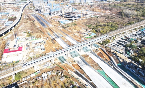11月26日,记者在济南奥体西路北延下穿胶济铁路立交桥工程现场了解到,胶济铁路线与工业北路之间的路面施工正在有序进行,其中胶济铁路至黄台联络线之间的道路已呈现雏形,部分路段开始铺设首层沥青路面,新建道路南段与下穿胶济铁路立交桥实现连通。框架桥在顶进到位后,上方开始安装透明特种玻璃。奥体西路是我市重要的南北交通通道,目前被铁路线分割为南北两段。按照计划,奥体西路北延采用下穿方式穿越胶济客专、胶济铁路、黄东联络线,让奥体西路南段与已贯通的奥体西路北延跨小清河段实现“牵手”。 (济南日报·爱济南记者 崔健 摄)