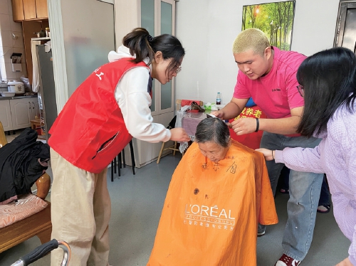 今年10月,社工站在对老年人群体深入开展需求调研的过程中了解到新园社区王阿姨的特殊困境,她的头发长得杂乱且纠缠,显得邋遢与疲惫。王阿姨年事已高且独居,本就需要借助拐杖才能艰难行动,因腿脚不便,下楼出行更为困难,出门理发也成了难事。经过调研,社工站发现,这一困境人群不在少数。社工站积极对接紫缘美业教育学院,经过多次沟通,与该学院达成合作意项,组建了一 支“阳光义剪”志愿服务队,每周走进辖区开展义剪志愿服务,并为出门难的高龄老人提供入户理发,让他们变得清爽利落。