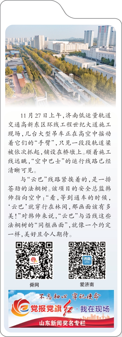 “‘云巴’体量小,运量低,有着空中独立的‘路权’。也就是说,它不受交通状况和信号灯的影响,独享空中这条路。尤其是对于上班的人来说,能做到准点通勤。”站在一张项目施工全景图前,韩帅细数着“云巴”的优点。图上所示的高新东区,人口相对密集,又有着众多重点产业发展项目,急需要一种便捷的交通方式融入全市轨道交通体系。正因为如此,济南的首条“云巴”项目选择在这里建设。图上,全长30.7公里的“云巴”线路全线均为高架,串联着高新东区四大片区和中国科学院济南科创城、生命科学城、智能装备城等产业园区,与地铁串联,与城市景观有机衔接,看上去十分和谐。