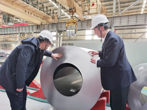 农行济南分行客户经理来到山钢高端钢材料生产车间,查看刚下线的高端钢板。