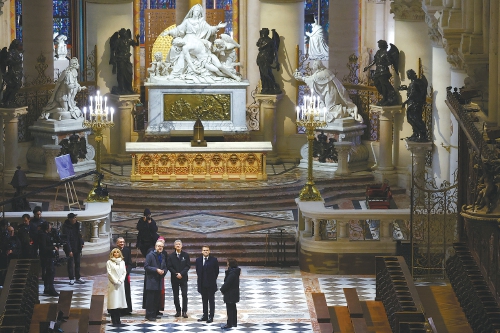 11月29日,法国总统马克龙(下右二)在巴黎圣母院内了解修复情况。2019年失火的法国巴黎圣母院经过修复,预计将于2024年12月8日重新开放。 (新华社发)