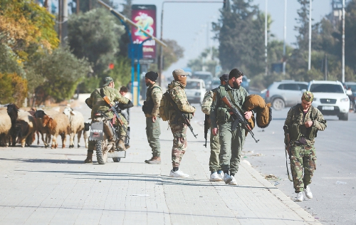 11月30日,叙利亚反对派武装人员走在阿勒颇的一条街道上。 (新华社发)