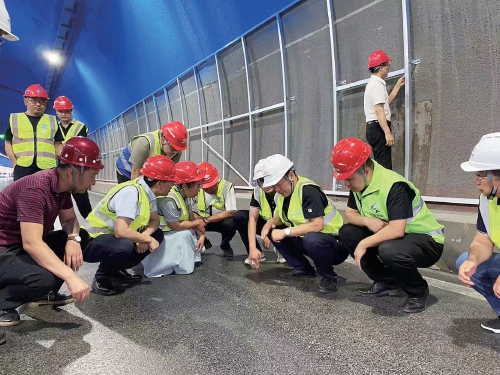 交通噪声对居民生活的影响很大,为了积极响应民生诉求,提升居民生活质量,建设者在本次提升改造工程中采用了一系列综合降噪措施,能够有效地降低隧道内的噪声水平,为周边居民创造一个更加舒适的生活环境。首先,在临近敞口段的洞内设置了吸音涂料和吸音板,能够有效吸收声波,减少声音在隧道内的反射和传播,从而降低噪声水平。其次,对隧道洞内及敞口段路面换铺了高粘高弹降噪路面材料,这种材料能够减少车辆行驶时产生的噪声,进一步提升降噪效果。此外,敞口段侧墙还设置了吸音板。这些吸音板不仅具有优异的吸音性能,还能美化隧道环境,提升整体视觉效果。同时,为了进一步增强降噪效果,本工程还将敞口段声屏障换新、加高,并将加高部分换为更为轻便、性价比更高的膜结构。