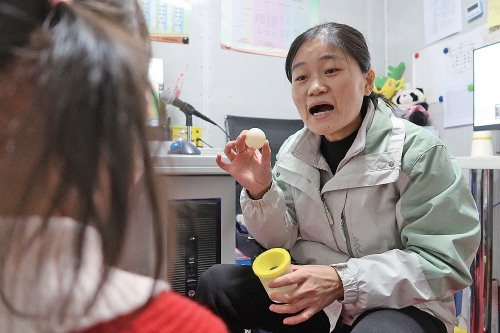 “这是乒乓球,晨晨你说,乒—乓—球。”张志温柔缓慢地示范着嘴型,满脸期待地注视着眼前的孩子。一脸稚嫩的晨晨耳后别着一枚小巧的人工耳蜗,她专注地盯着老师手中的小圆球,奶声奶气、一字一顿地说:“乒、乓、球。”