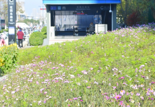 12月2日,在济南轨道交通3号线花园东路站C出口外,一处近5000平方米的“城市花海”吸引了过往市民的关注,虽然近日泉城大幅降温,最低气温降至0℃以下,但这里却一派“春色满园”的景象,不仅有碧绿的大草坪,还有盛开的大片波斯菊,在蓝天映衬下,为冬日济南增添一抹“春的气息”。据了解,这里曾是一片荒地,经过综合整治并栽种四季青草和波斯菊花种后焕发新活力,成为城市地铁沿线一道亮丽景观。(济南日报·爱济南记者 崔健 摄)