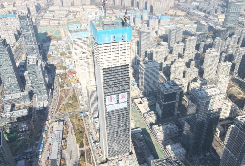 近日,位于济南中央商务区的济南信泰中心项目主塔楼建设冲刺最高层。目前,主塔楼63层顶板浇筑完成,64层开始放线中;主塔楼装修施工开始,已移交工作面6层至49层;幕墙安装进度完成64%。据了解,该项目主塔楼总高度约326米,代表济南CBD“山、泉、湖、河、城”五座超高层建筑中“城”元素,建成后将成为济南CBD第三高楼。 (济南日报·爱济南记者 崔健 摄)