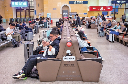 旅客坐在电动按摩椅上可边做按摩边给手机充电。