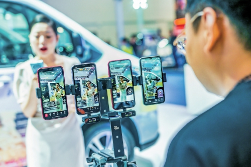 齐鲁国际车展依维柯展台,一人用四部手机同时在多个平台做现场直播推介。