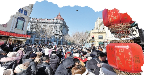 2024年2月12日,游客在哈尔滨中央大街游玩。
