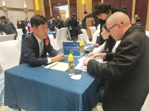 唐明(左)在退役军人创业成果展上介绍新产品。