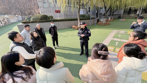 活动分为训练和演练两个阶段。训练阶段的分组练习扎实且全面,在操场的体育课场景、教室的文化课场景以及学校门口放学场景中,第一组学生在教官秦浩、吕更建、马磊的带领下,通过模拟不同情境,学习观察周边情况、躲避危险迅速撤离、丢弃负重等逃生方法,有效提升了自我防护意识与应急反应能力。第二组的老师和家长代表在教官田士锋的带领下,接受了利用地形地物与就便器材进行自我防卫的训练,以便在危险来临时更好地保护学生。第三组保卫干事和保安队员则着重跟随教官陈峰进行安保器材使用训练,通过熟练掌握装备,形成队组战术配合,增强了班组协同配合与防卫能力,为校园安保工作提供了有力保障。